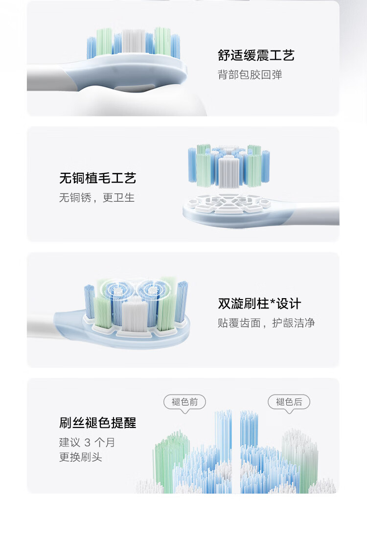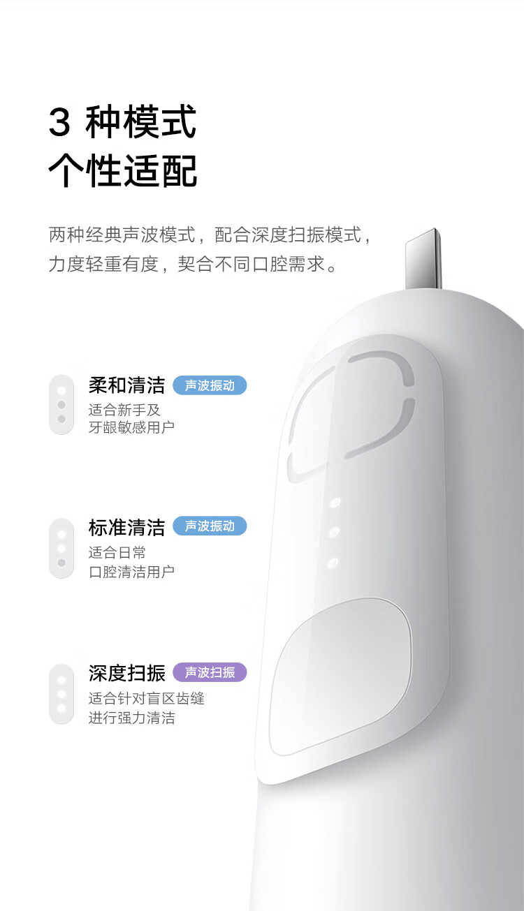 技术革新;搭载扫振声波马达;边扫边振;驱动刷头实现双倍摆角;续航180天;3种配色