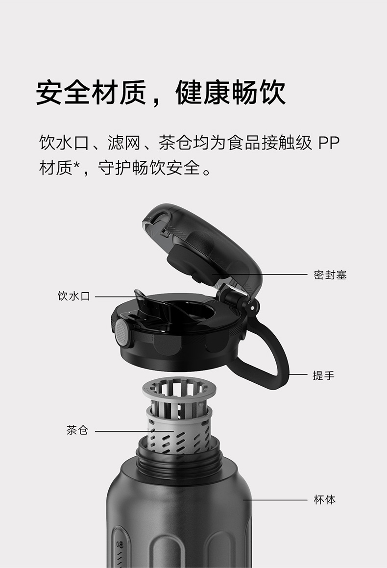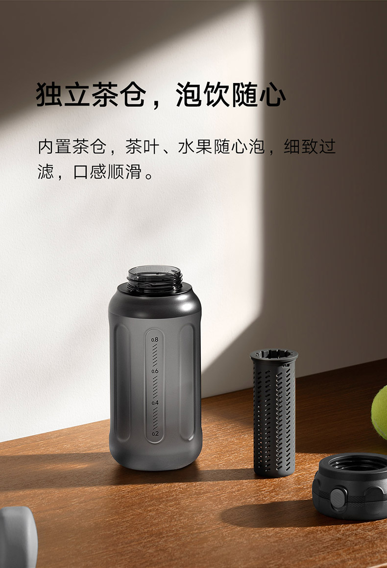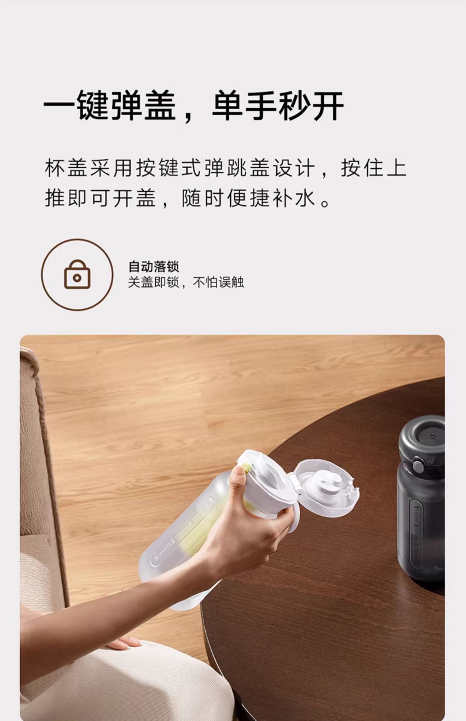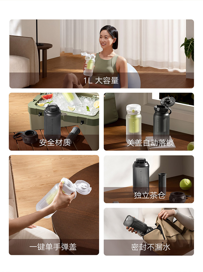 1L容量酣补水;关盖落锁安心随行;独立茶仓;密封不漏水;一键单手弹盖