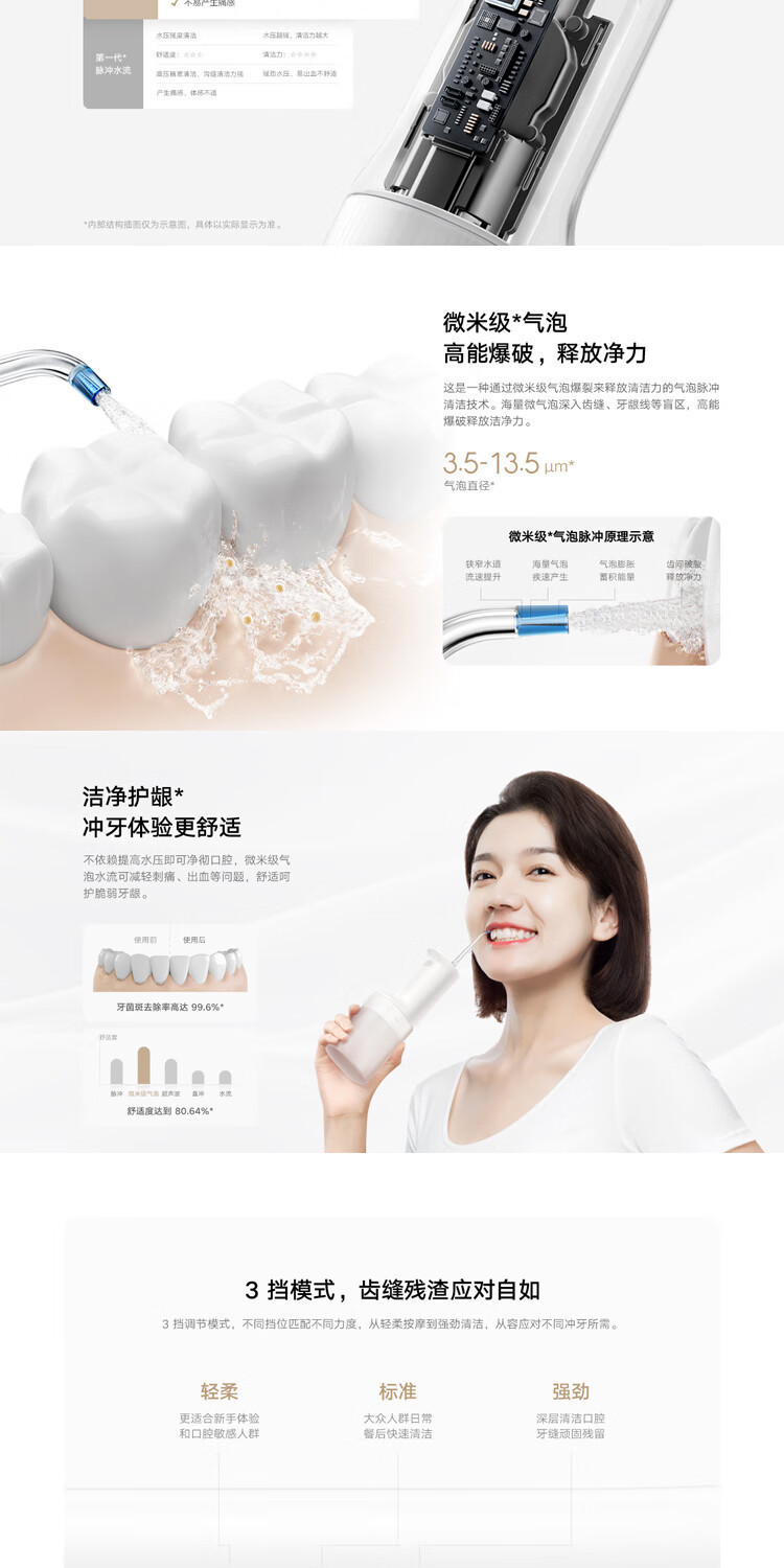 微米级气泡脉冲;200ml水箱大容量;90天持久续航;微气泡喷嘴;爆破洁净防刺痛;四挡模式