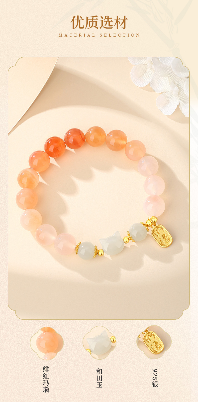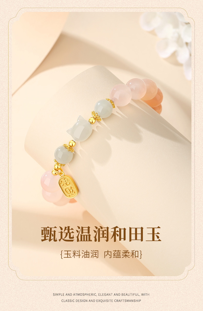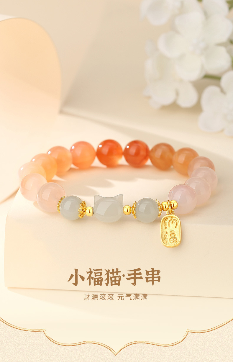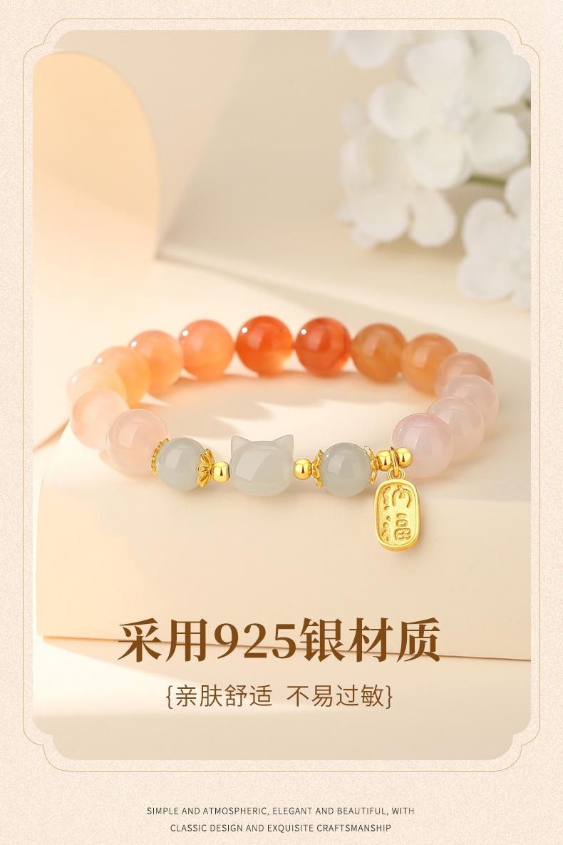 小福猫手串 绯红玛瑙+和田玉 国风 S925纯银手链