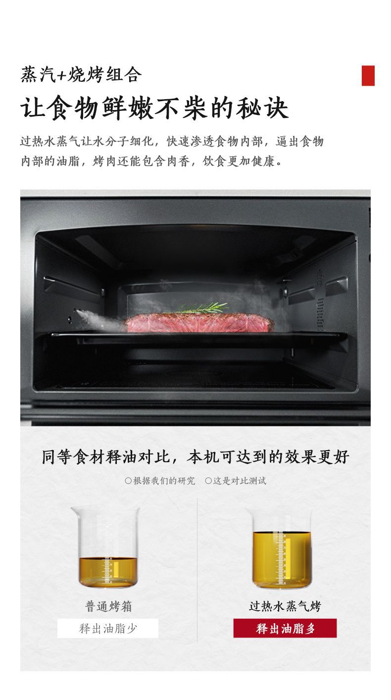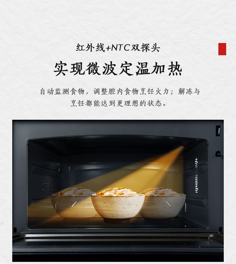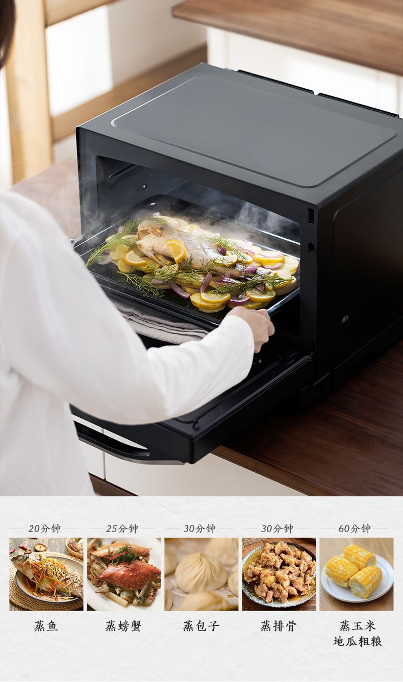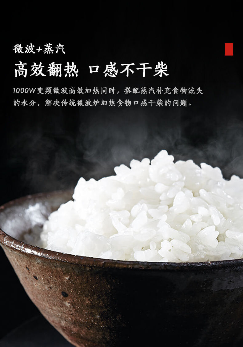 无烟烹饪,微波+蒸汽,高效翻热口感不干柴;
