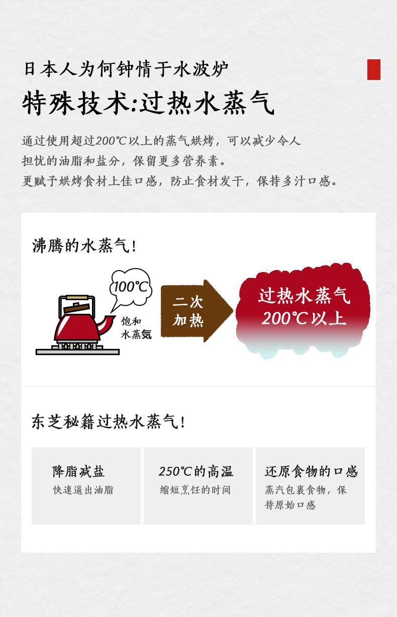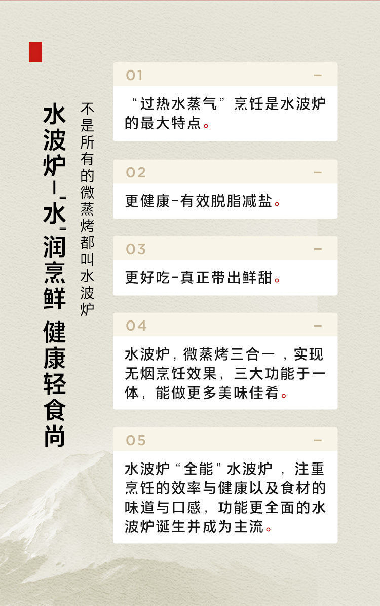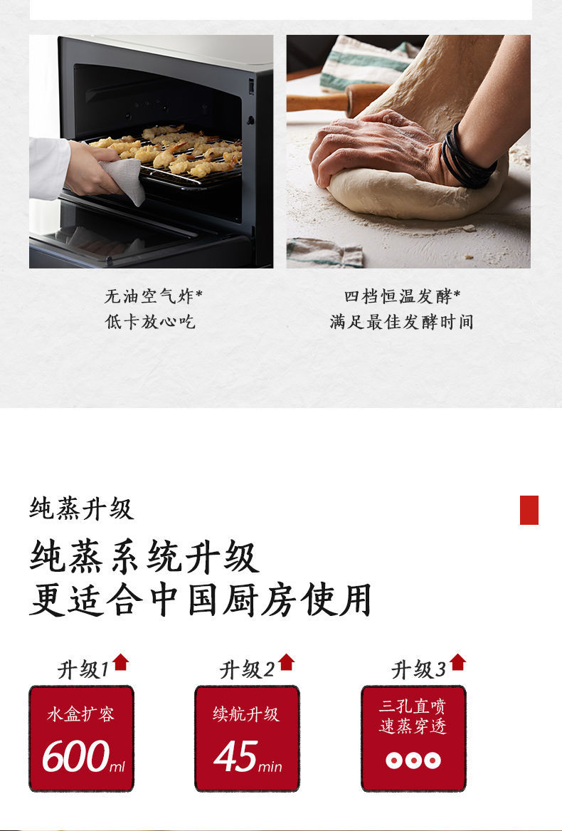 无烟烹饪,微波+蒸汽,高效翻热口感不干柴;