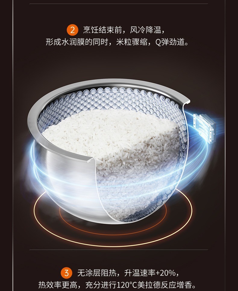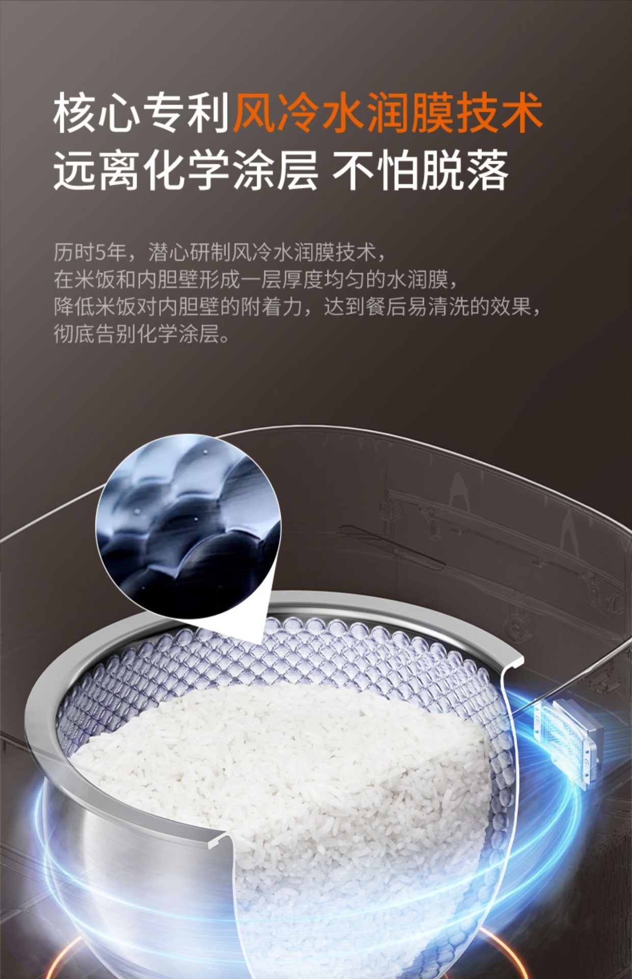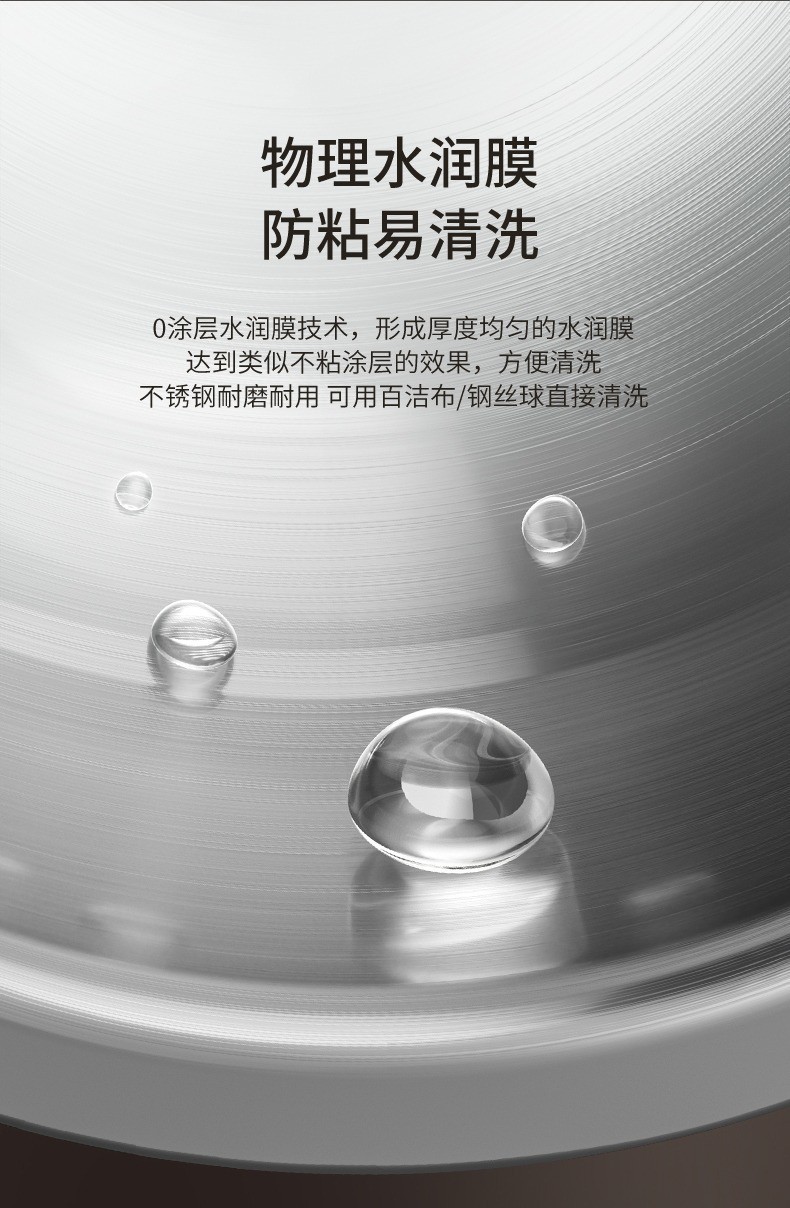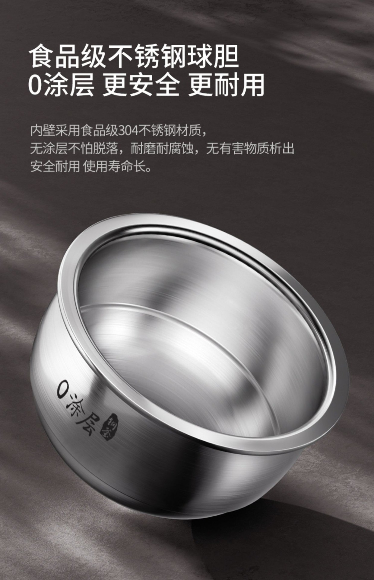 食品级不锈钢球胆,0涂层更安全;IH电磁变频加热;风冷水润膜技术,远离化学涂层,不怕脱落;