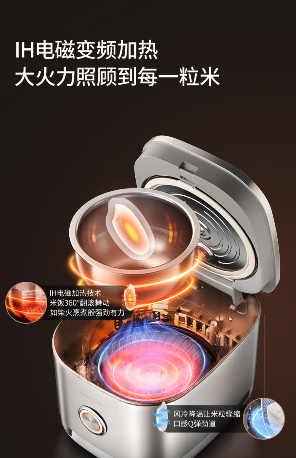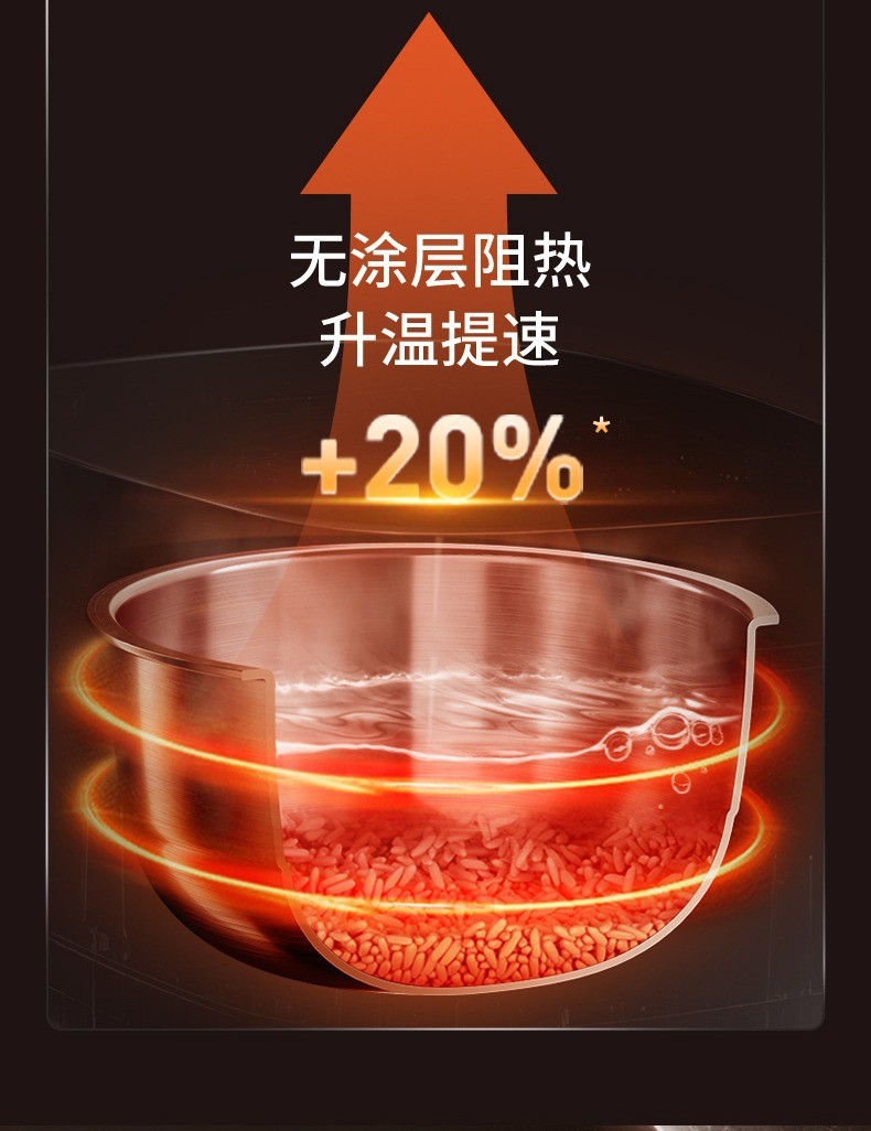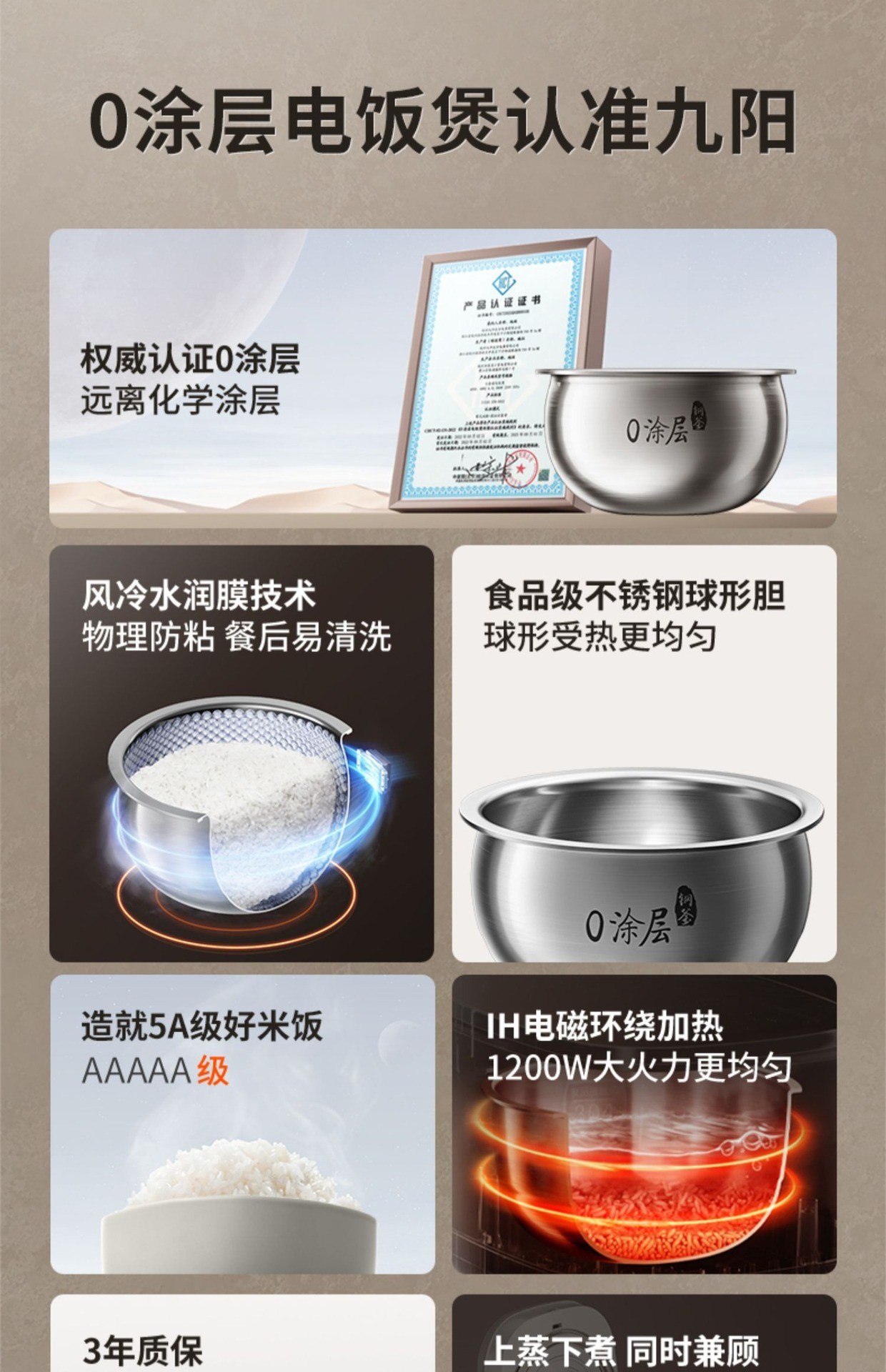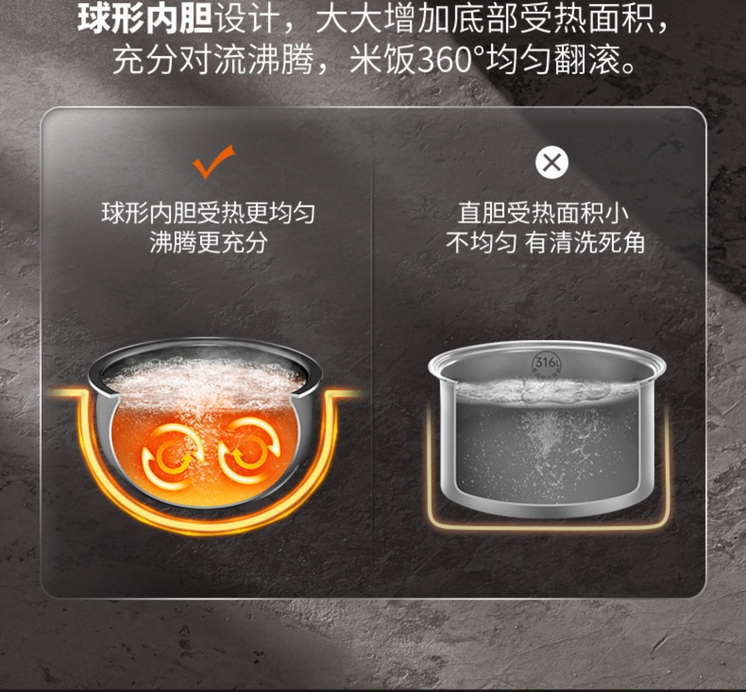 食品级不锈钢球胆,0涂层更安全;IH电磁变频加热;风冷水润膜技术,远离化学涂层,不怕脱落;