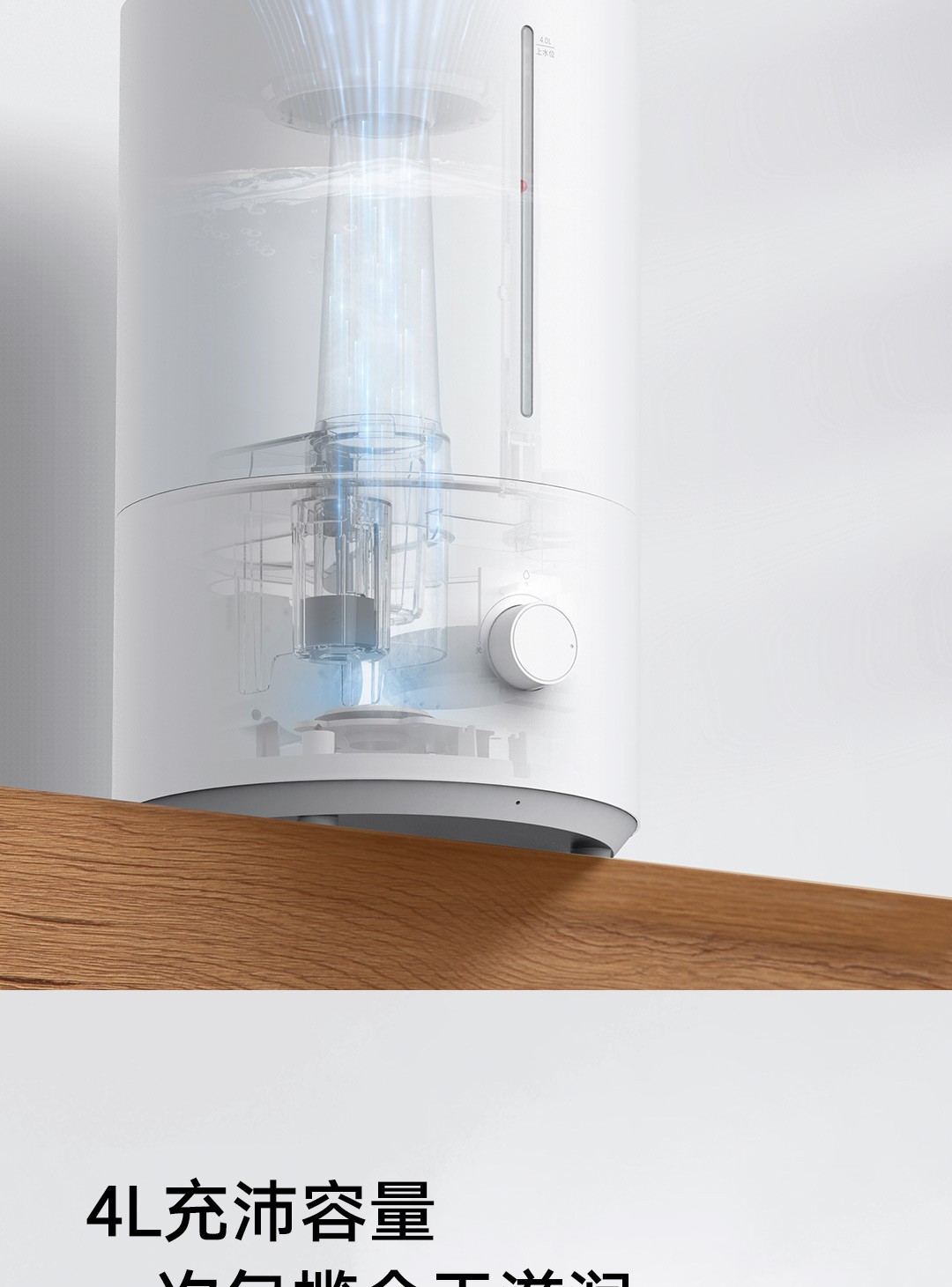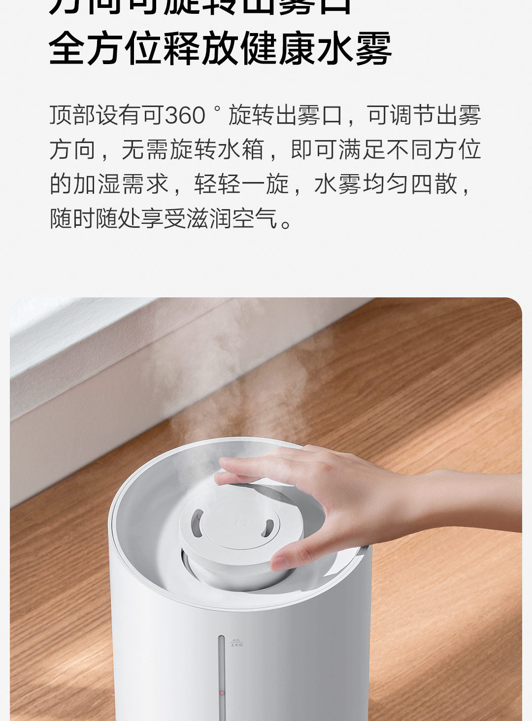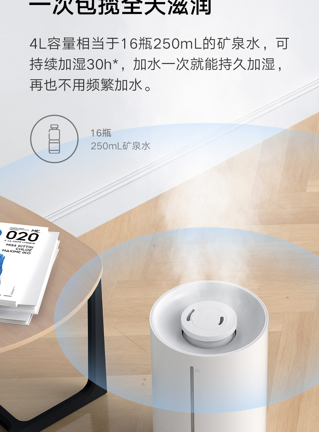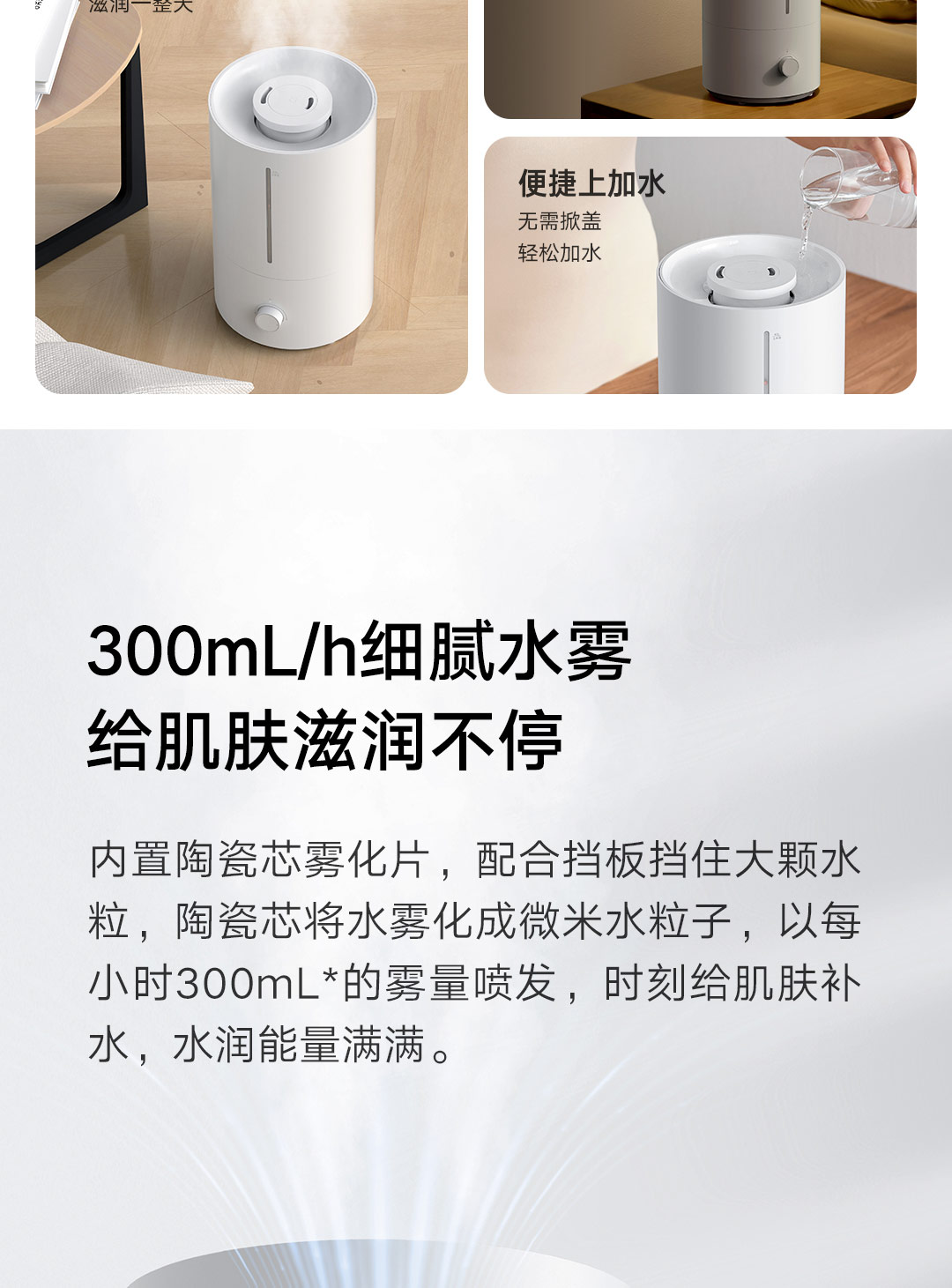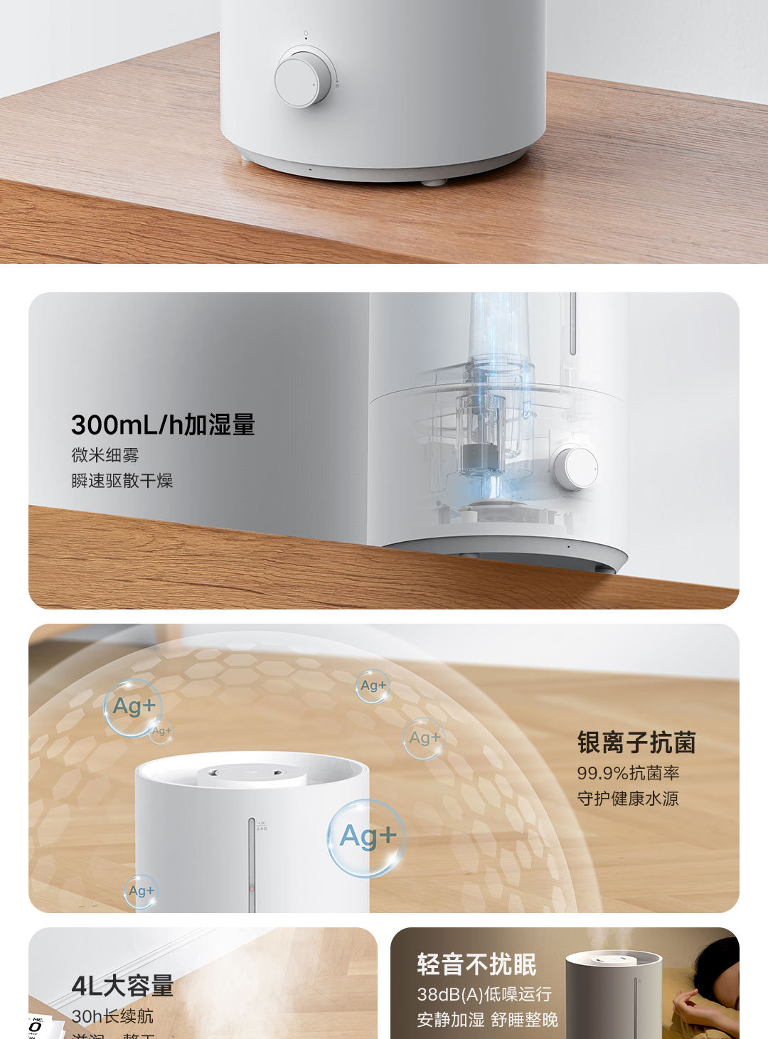 轻音加湿 充沛雾量 银离子抗菌;300m/h细腻水雾 4L充沛容量 可持续加湿30H