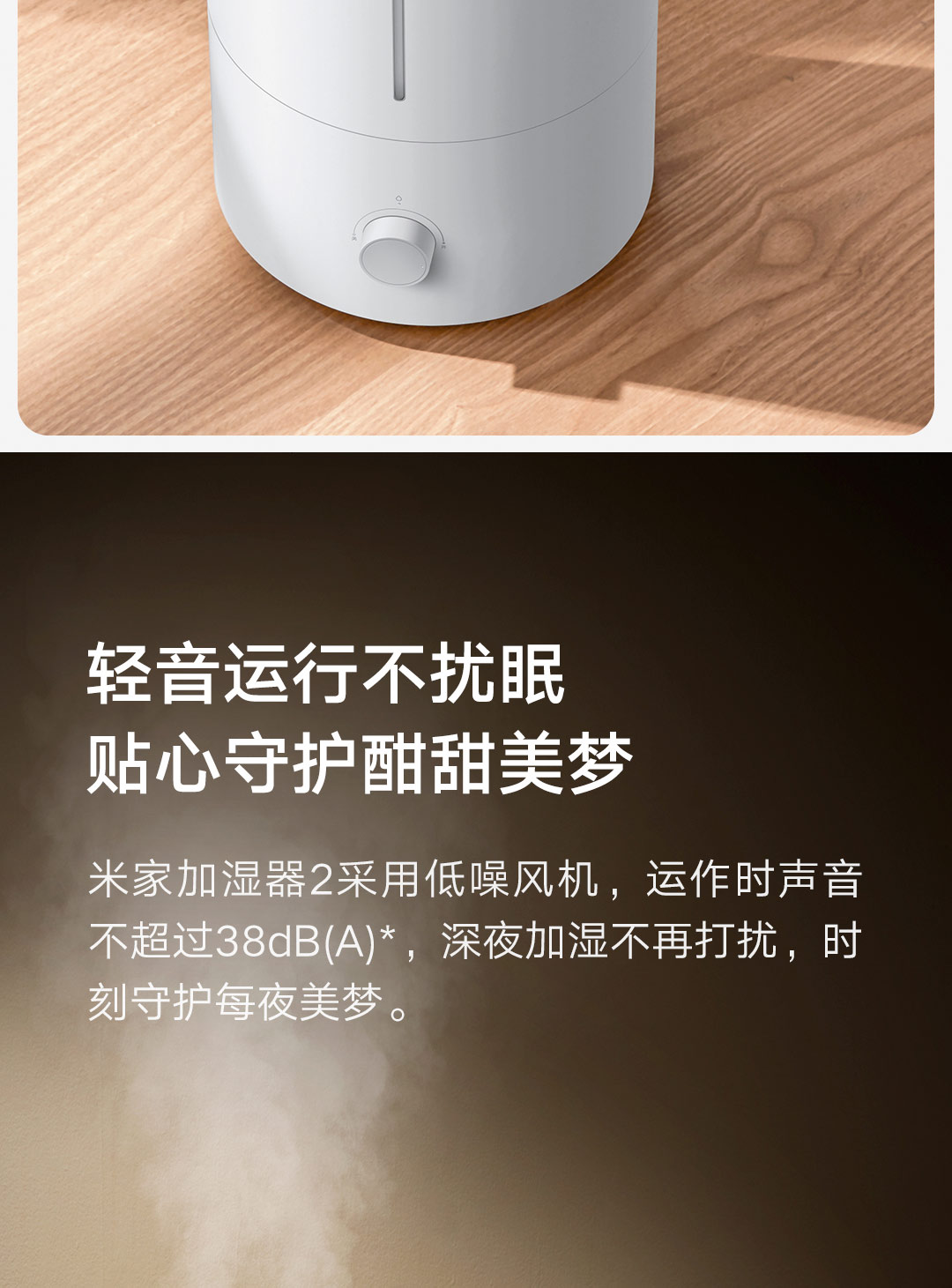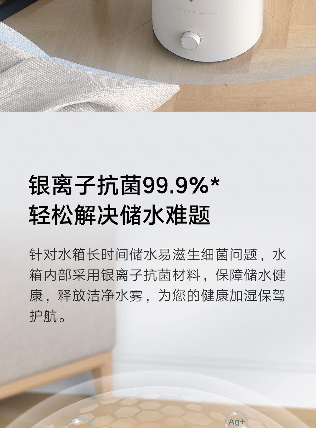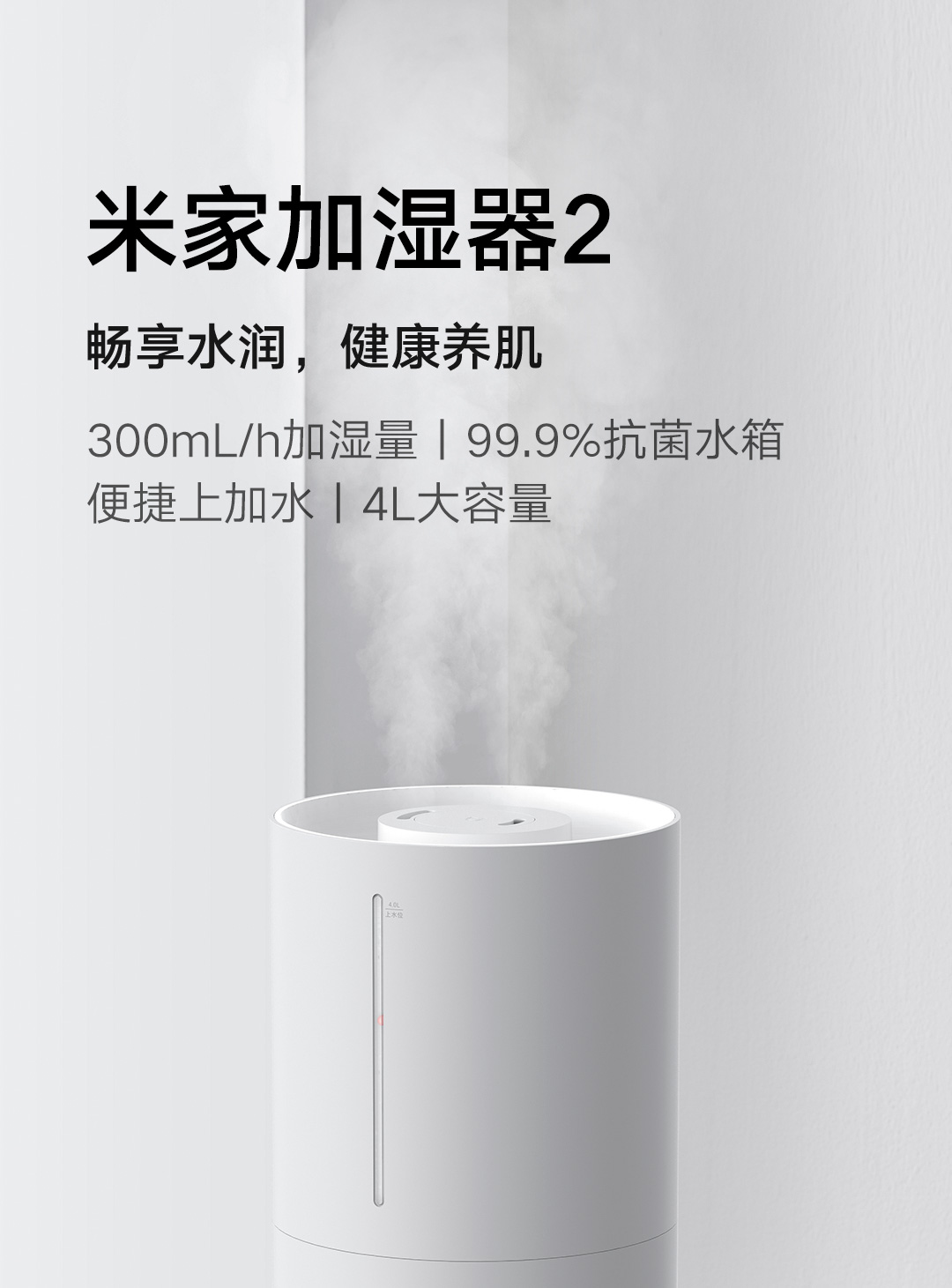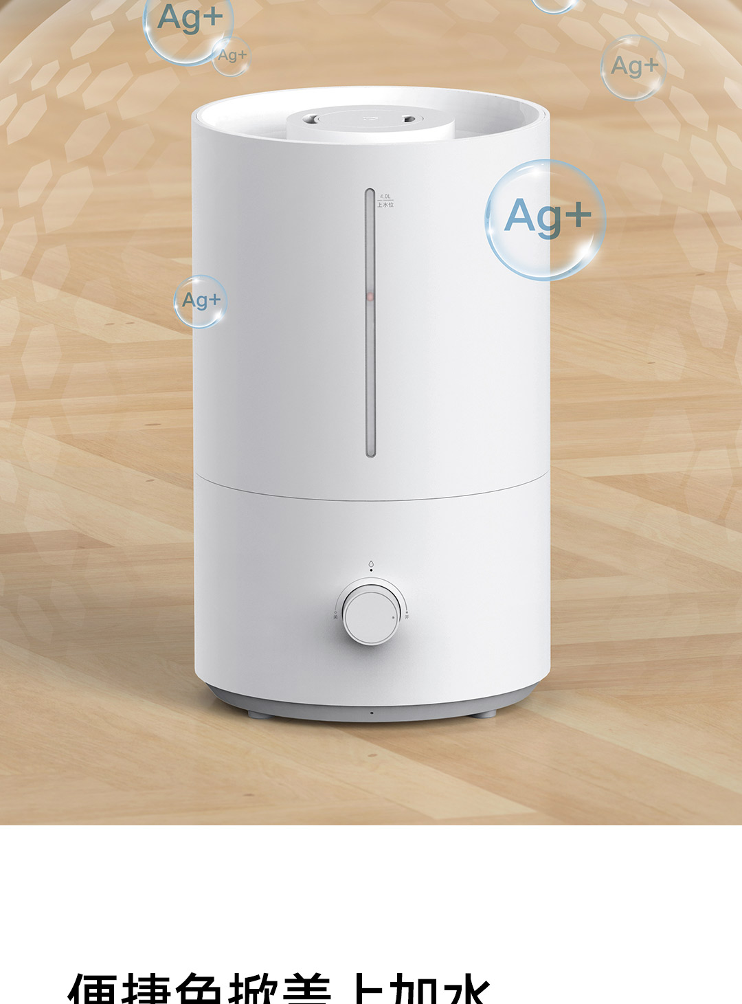 轻音加湿 充沛雾量 银离子抗菌;300m/h细腻水雾 4L充沛容量 可持续加湿30H