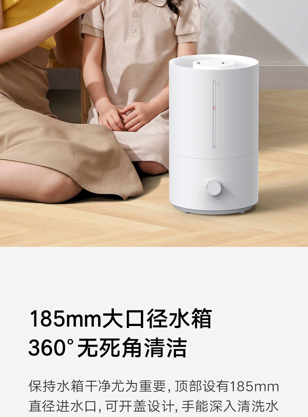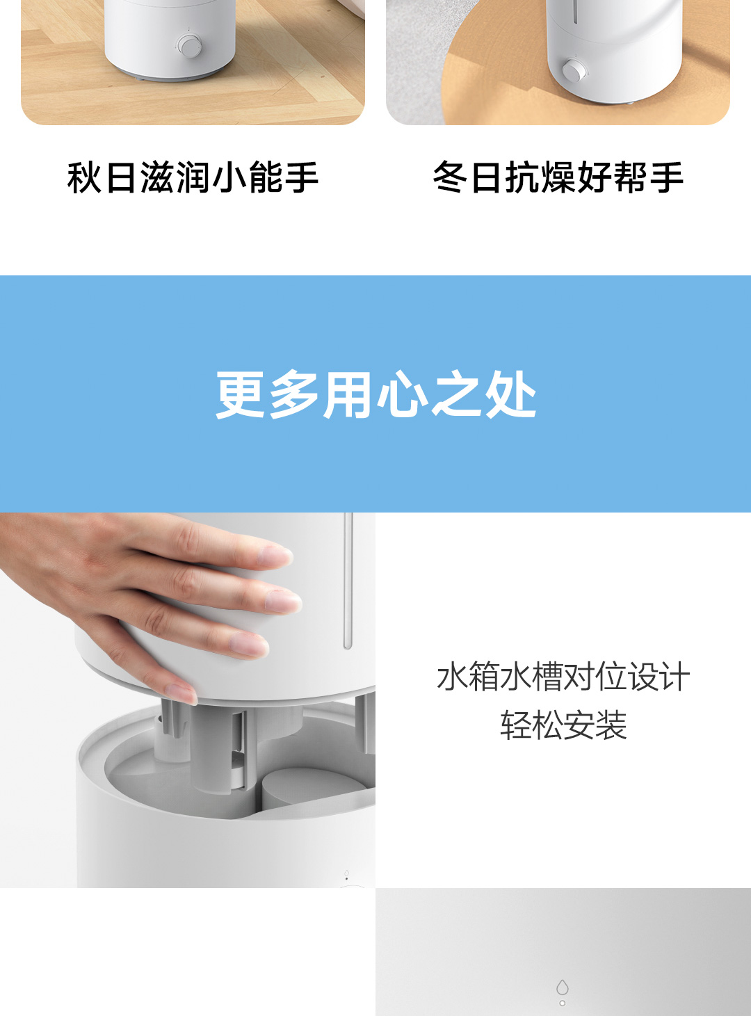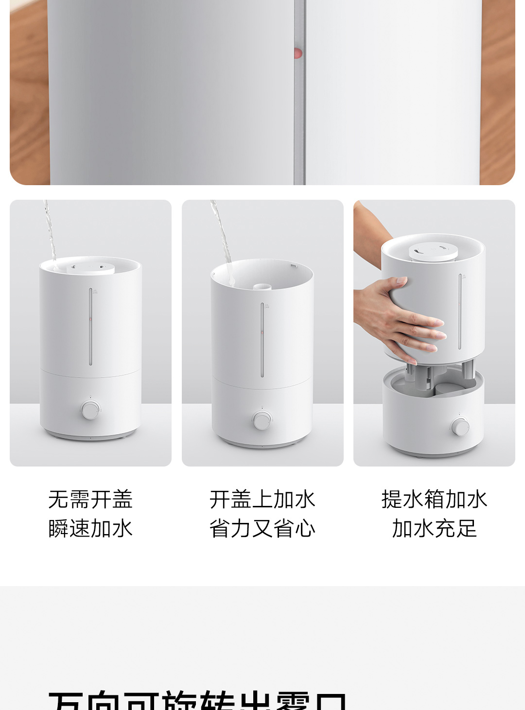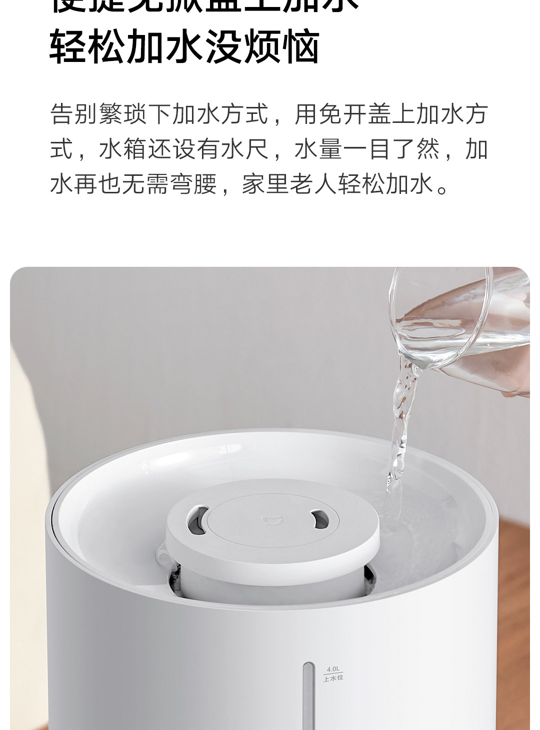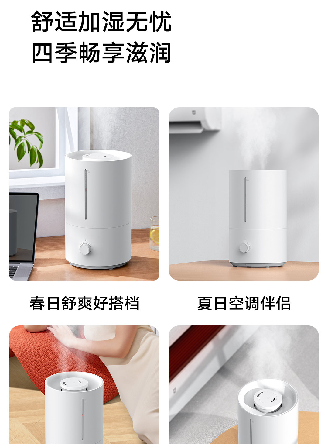 轻音加湿 充沛雾量 银离子抗菌;300m/h细腻水雾 4L充沛容量 可持续加湿30H