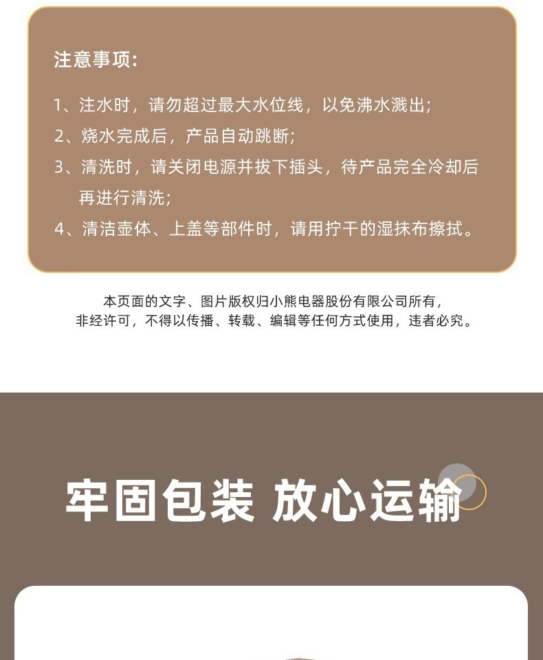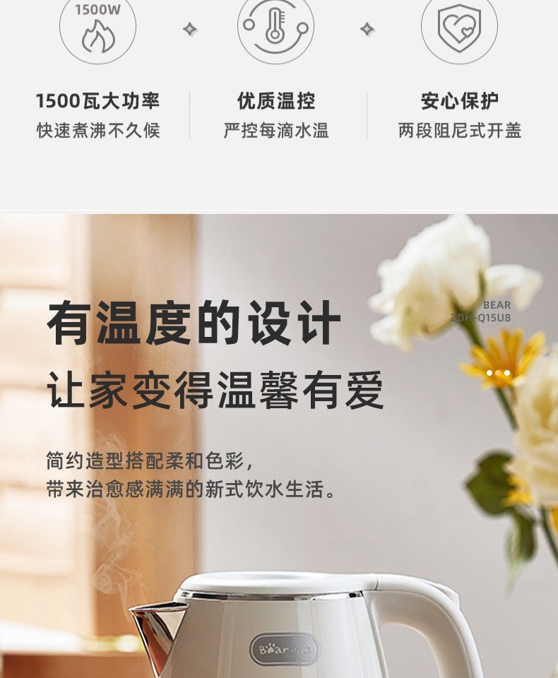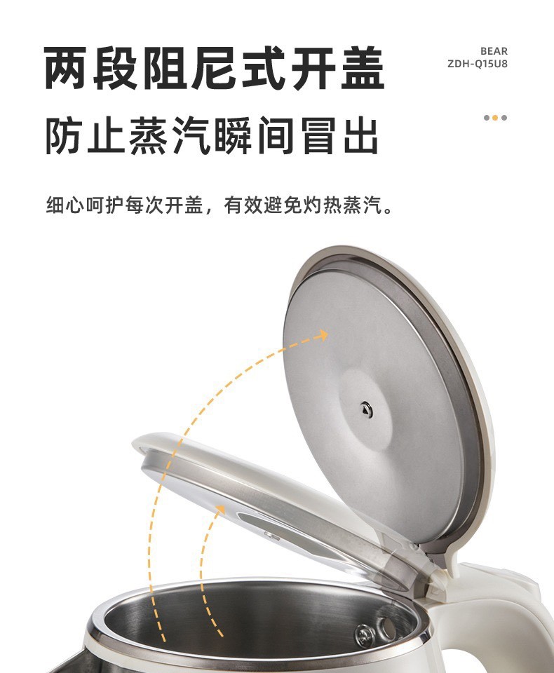 1500W大功率,两段阻尼式开盖;防止蒸汽瞬间冒出,自动停止加热;