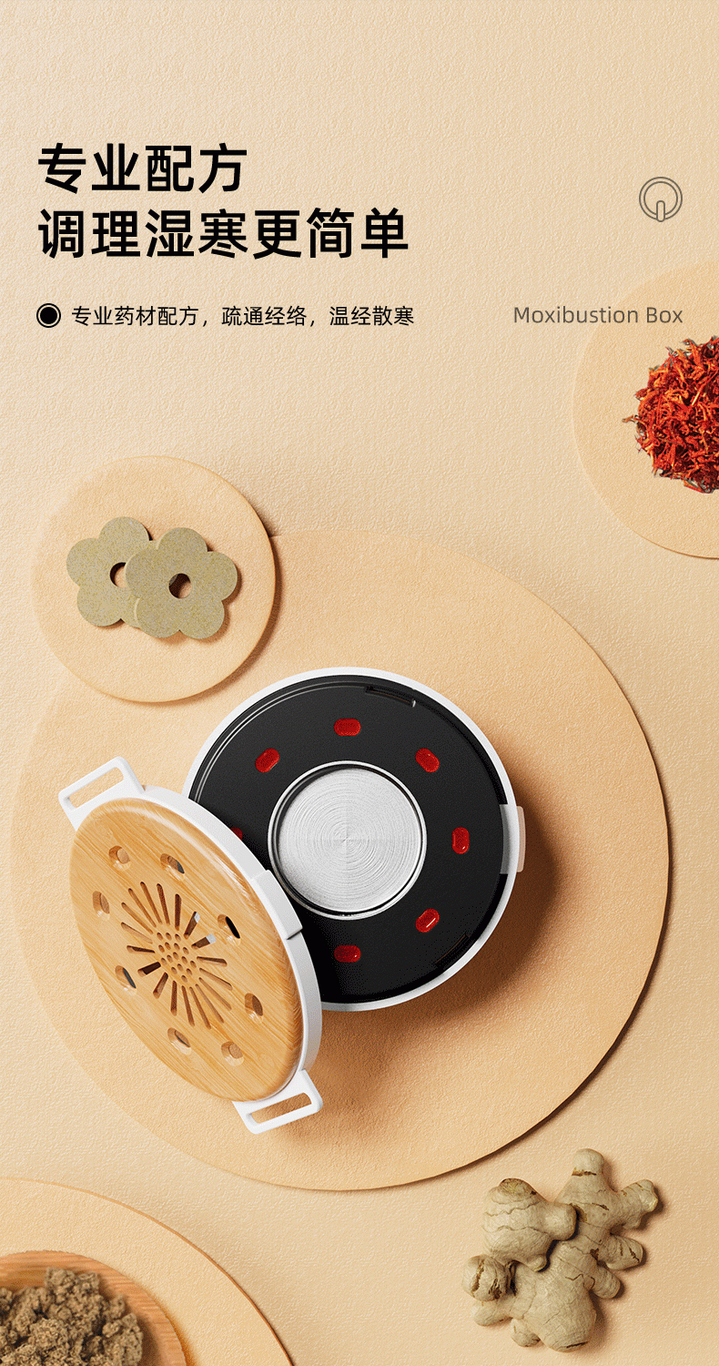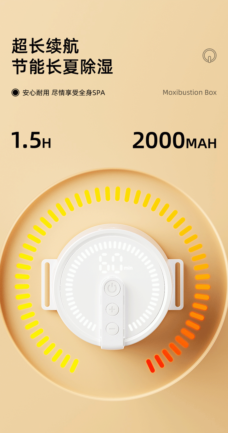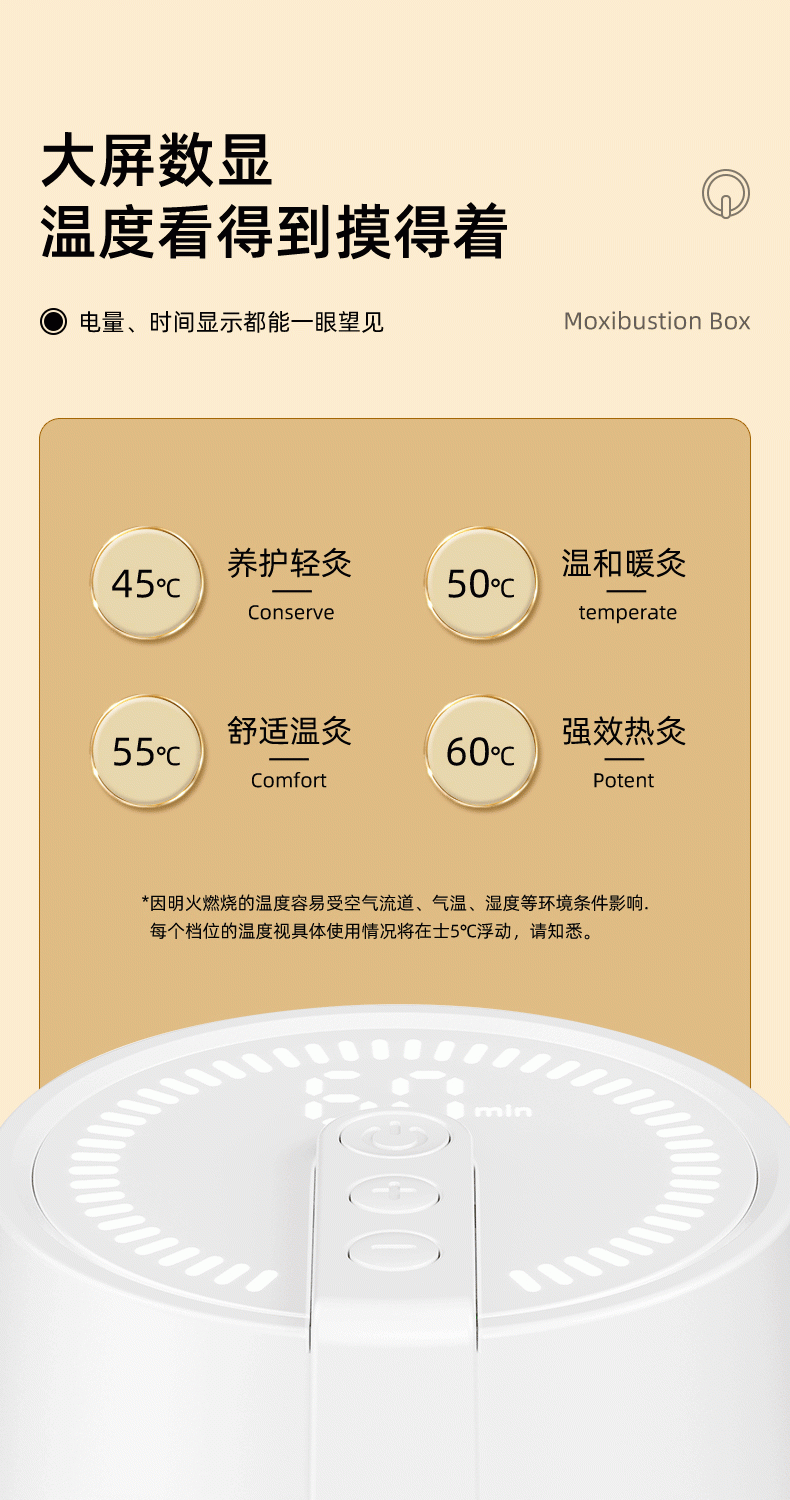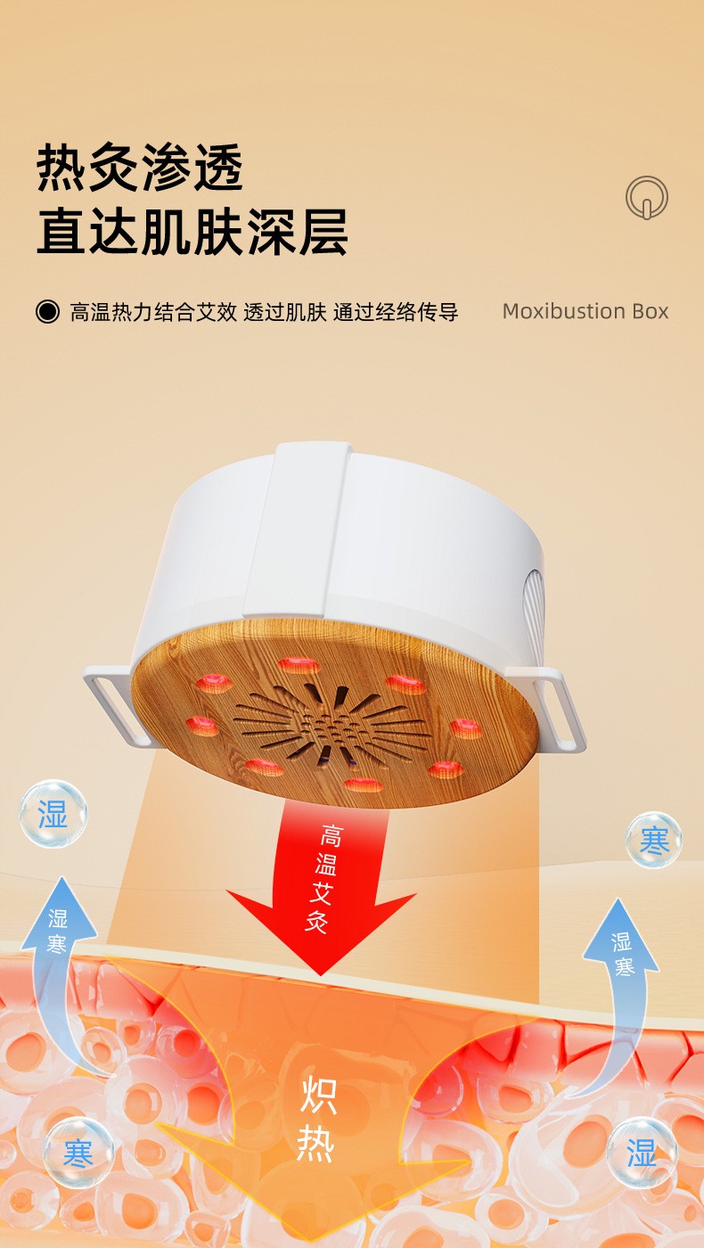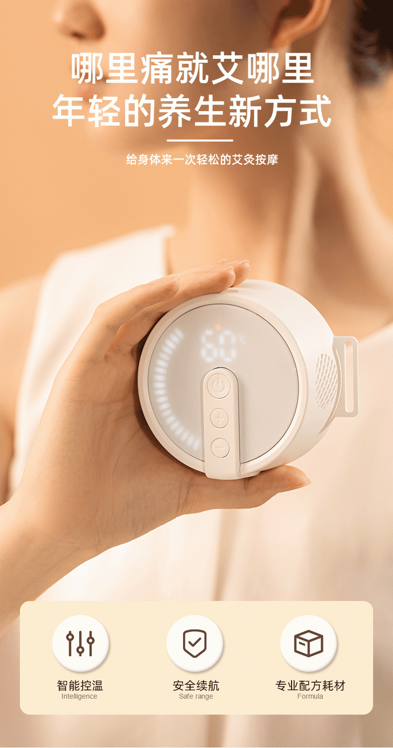 高温艾灸,经络传导祛湿祛寒,健康养生;开机自动点火,内置电弧打火机快速导热;大屏数显,4档温度可调节,贴心养护身体;