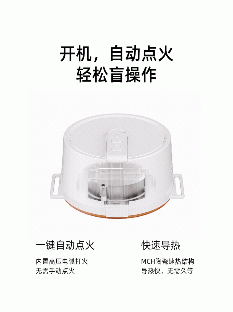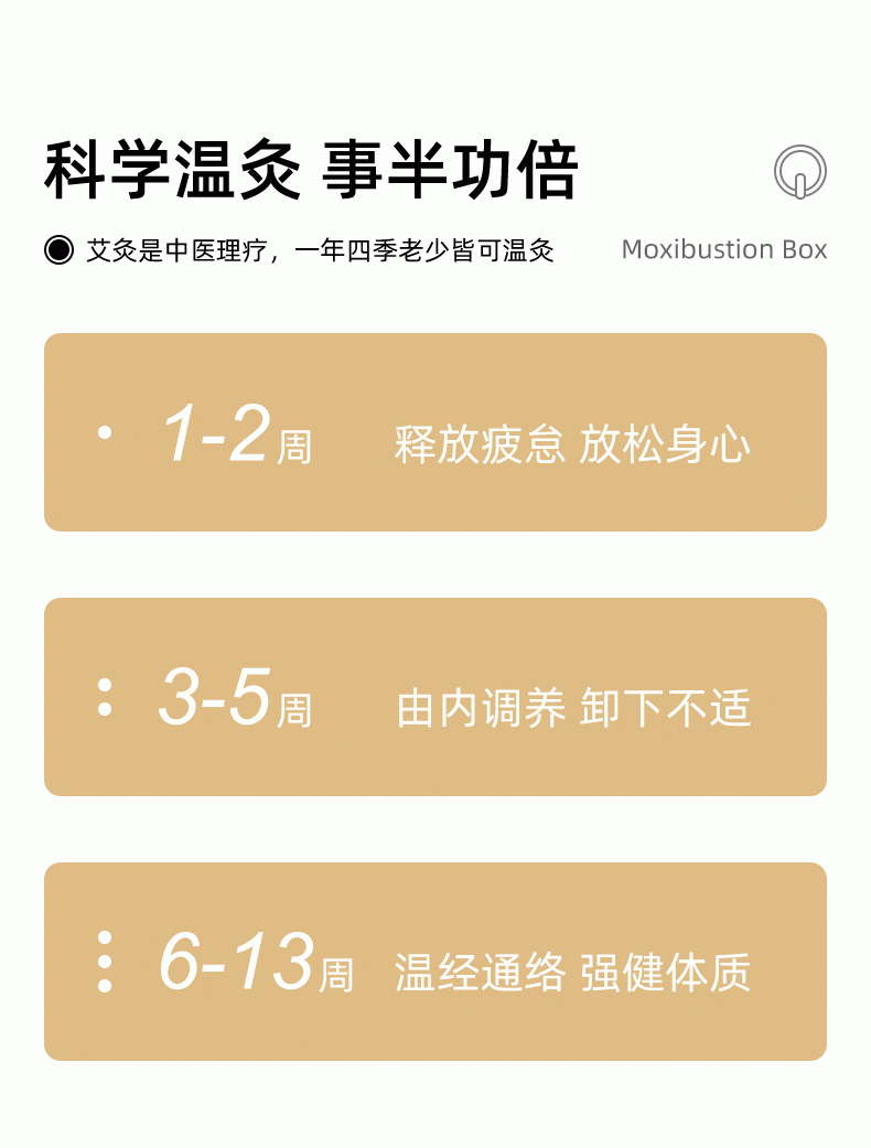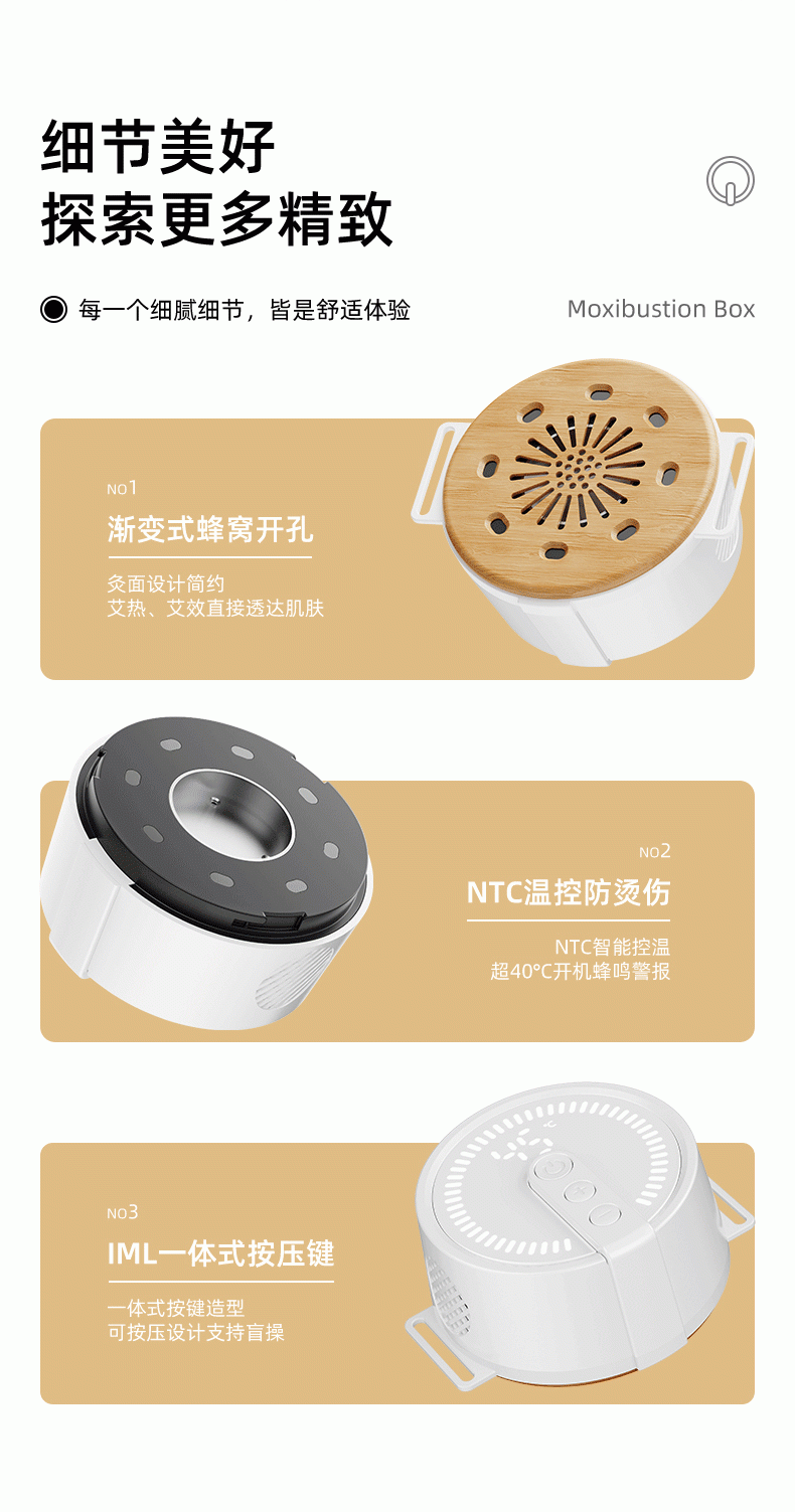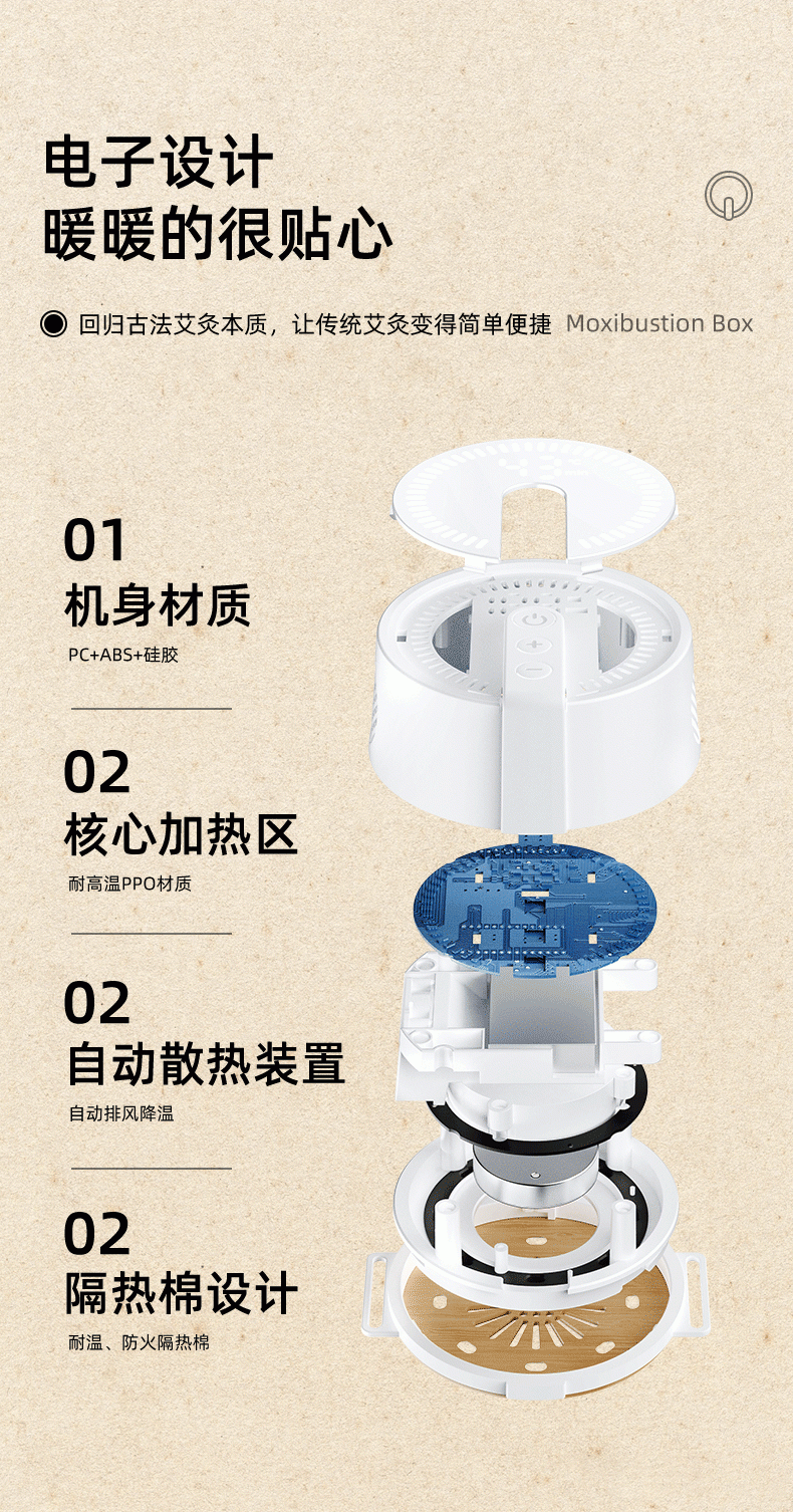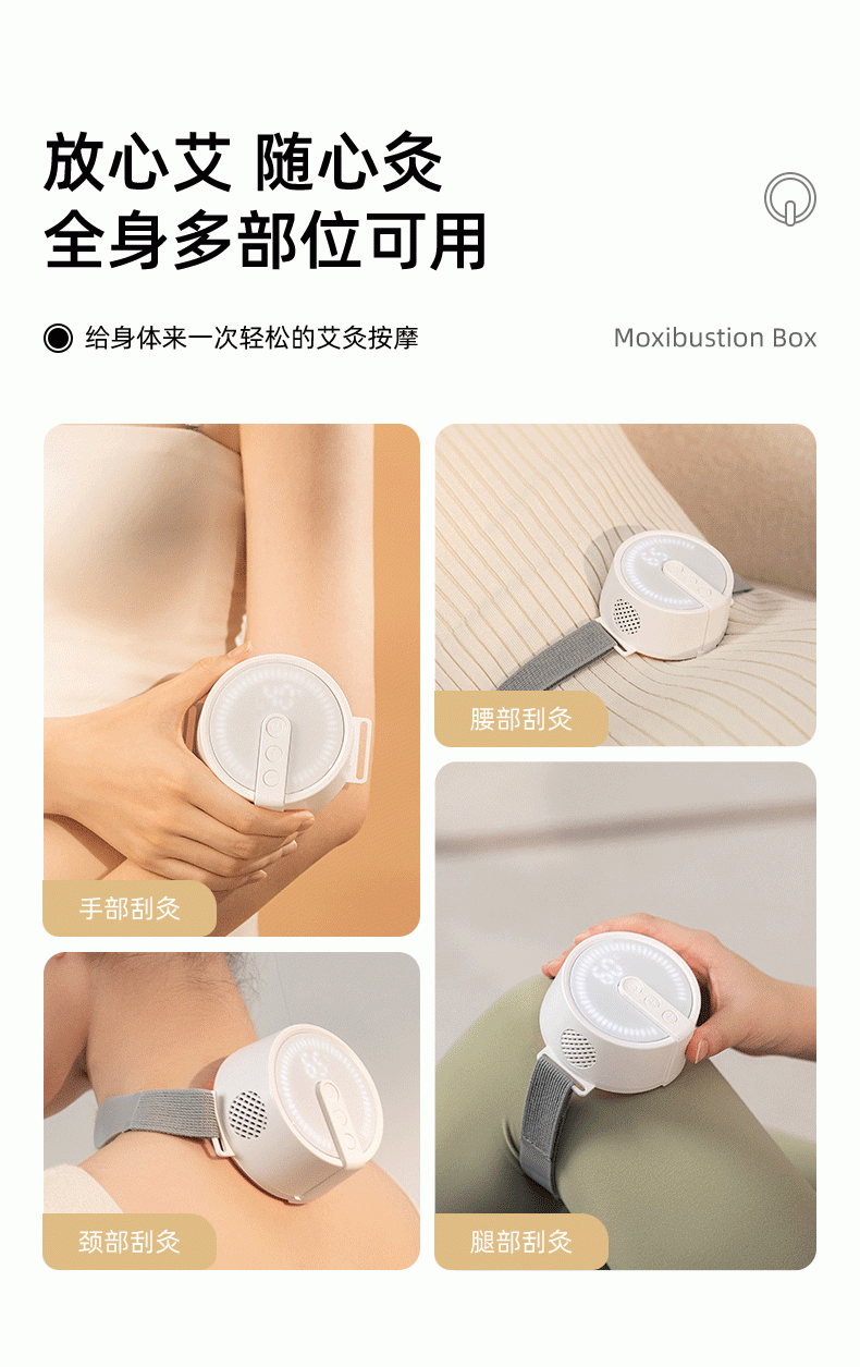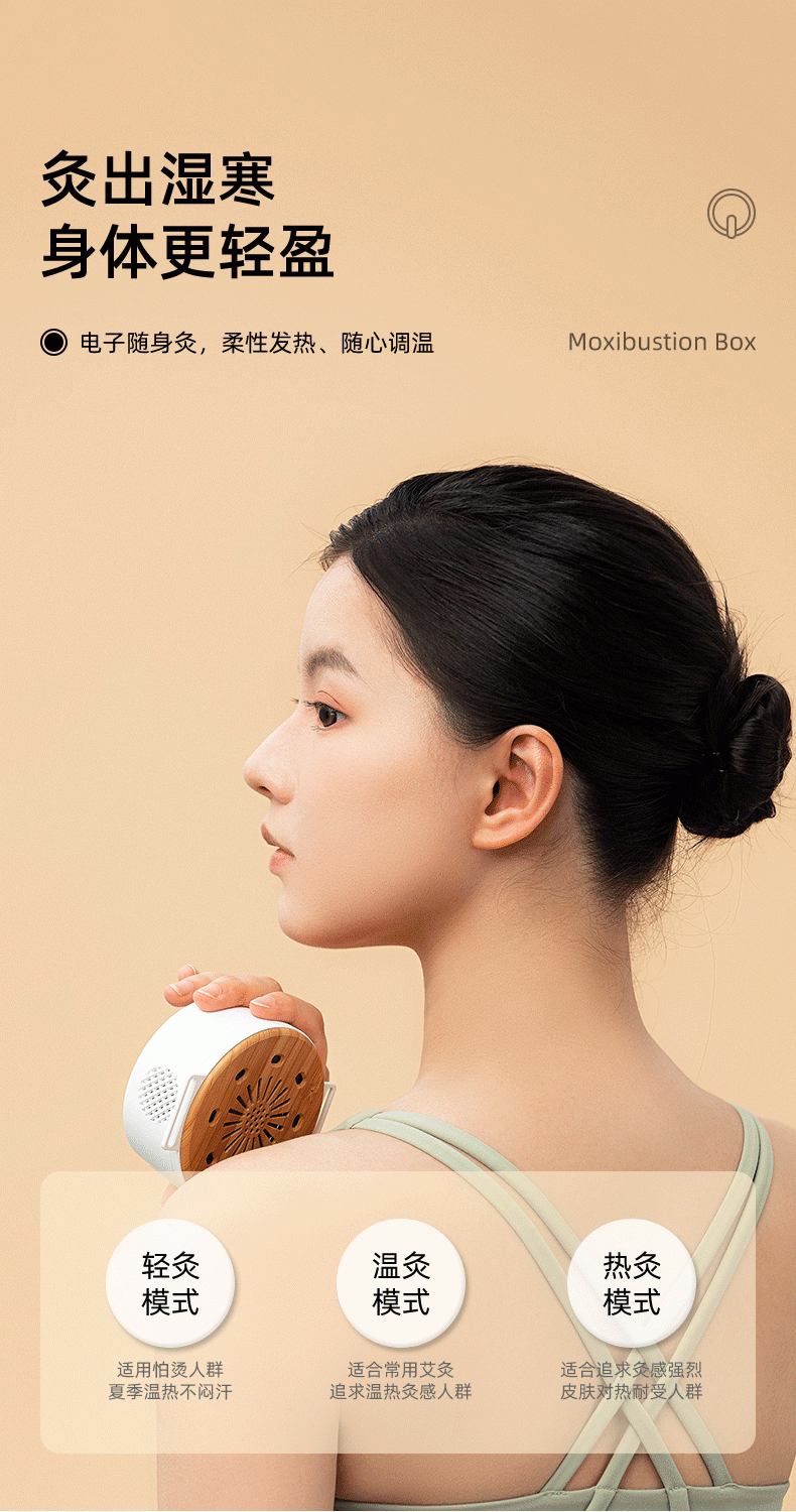 高温艾灸,经络传导祛湿祛寒,健康养生;开机自动点火,内置电弧打火机快速导热;大屏数显,4档温度可调节,贴心养护身体;